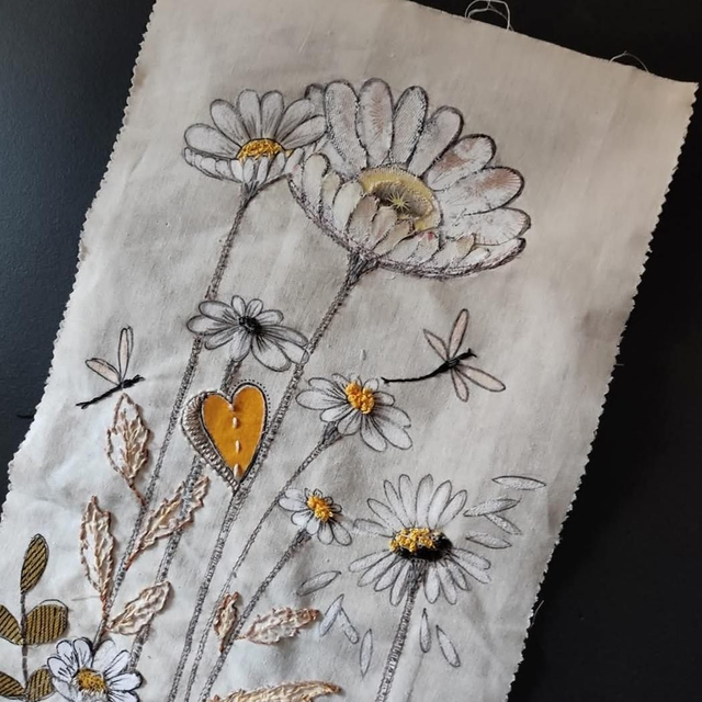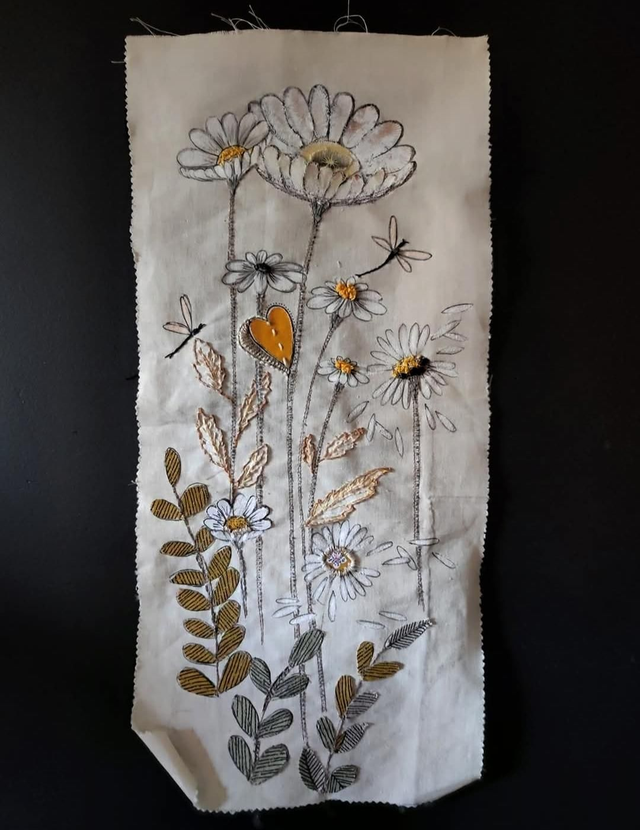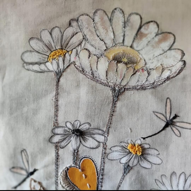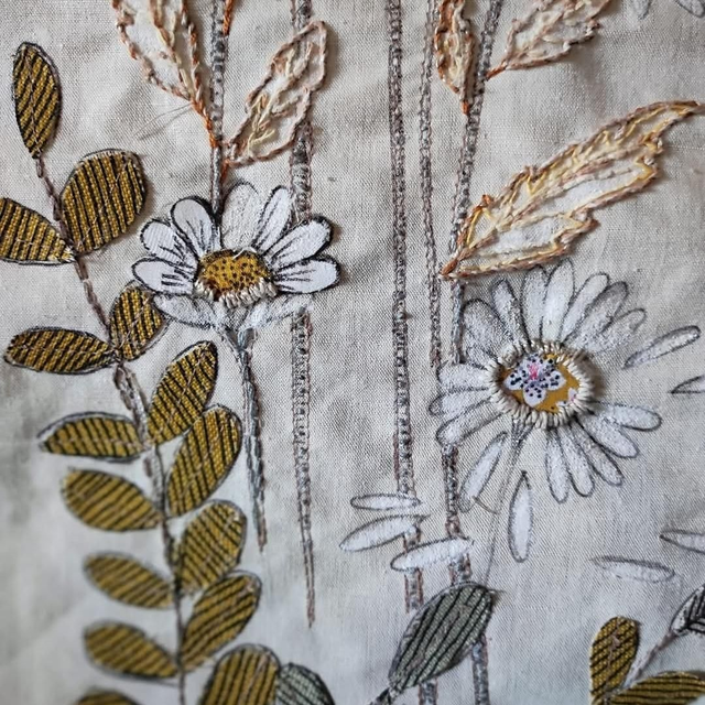 Broderie faite main, collage, tissu, pastels huile