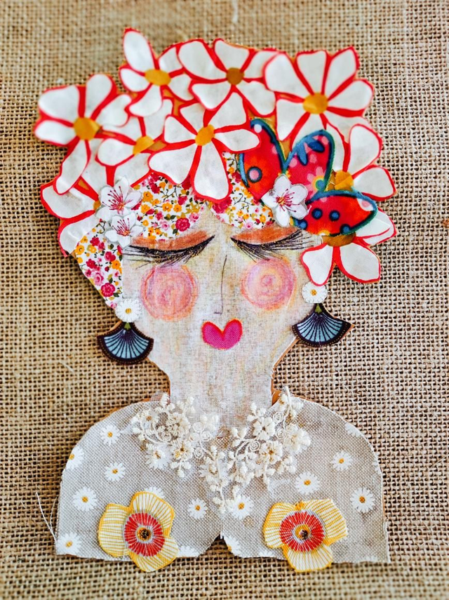Tableau arts textiles portrait - collage femme au bonnet