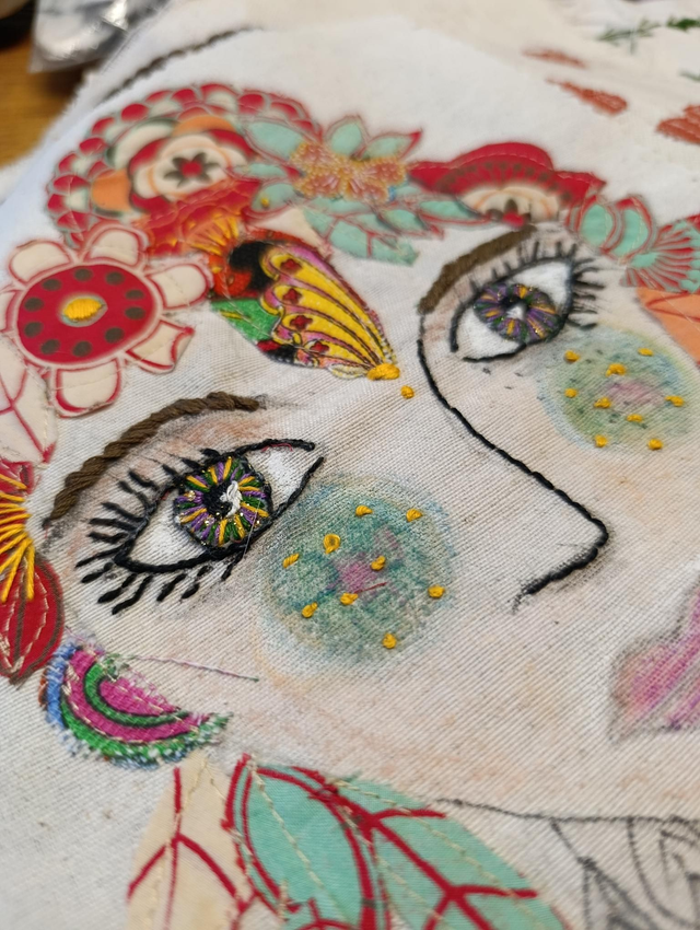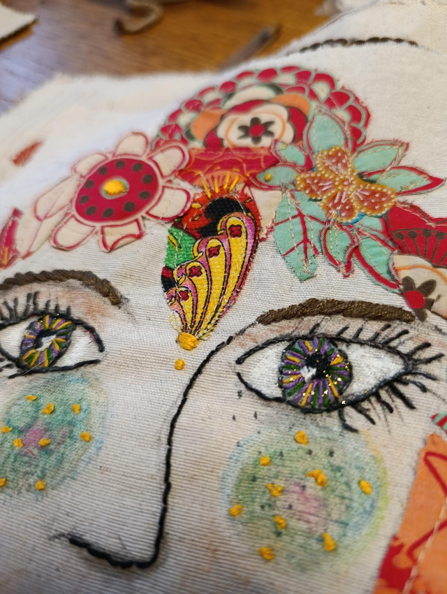 Broderie faite main, collage, tissu, pastels huile